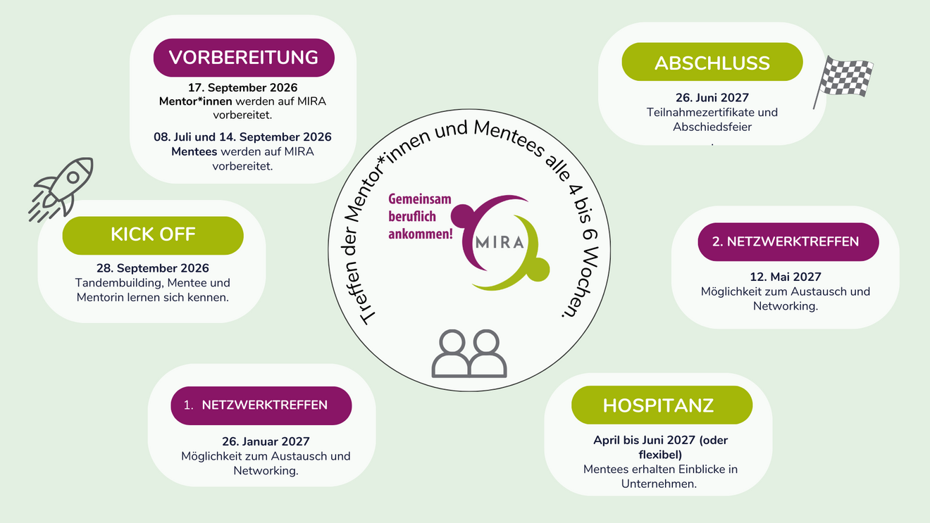 MIRA startet mit Vorbereitungstreffen im Juli und September 2026. Am 28.09.2026 findet die Kick Off Veranstaltung statt. Danach treffen Sie sich alle 4 bis 6 Wochen mit Ihrem Mentor/Ihrer Mentorin.